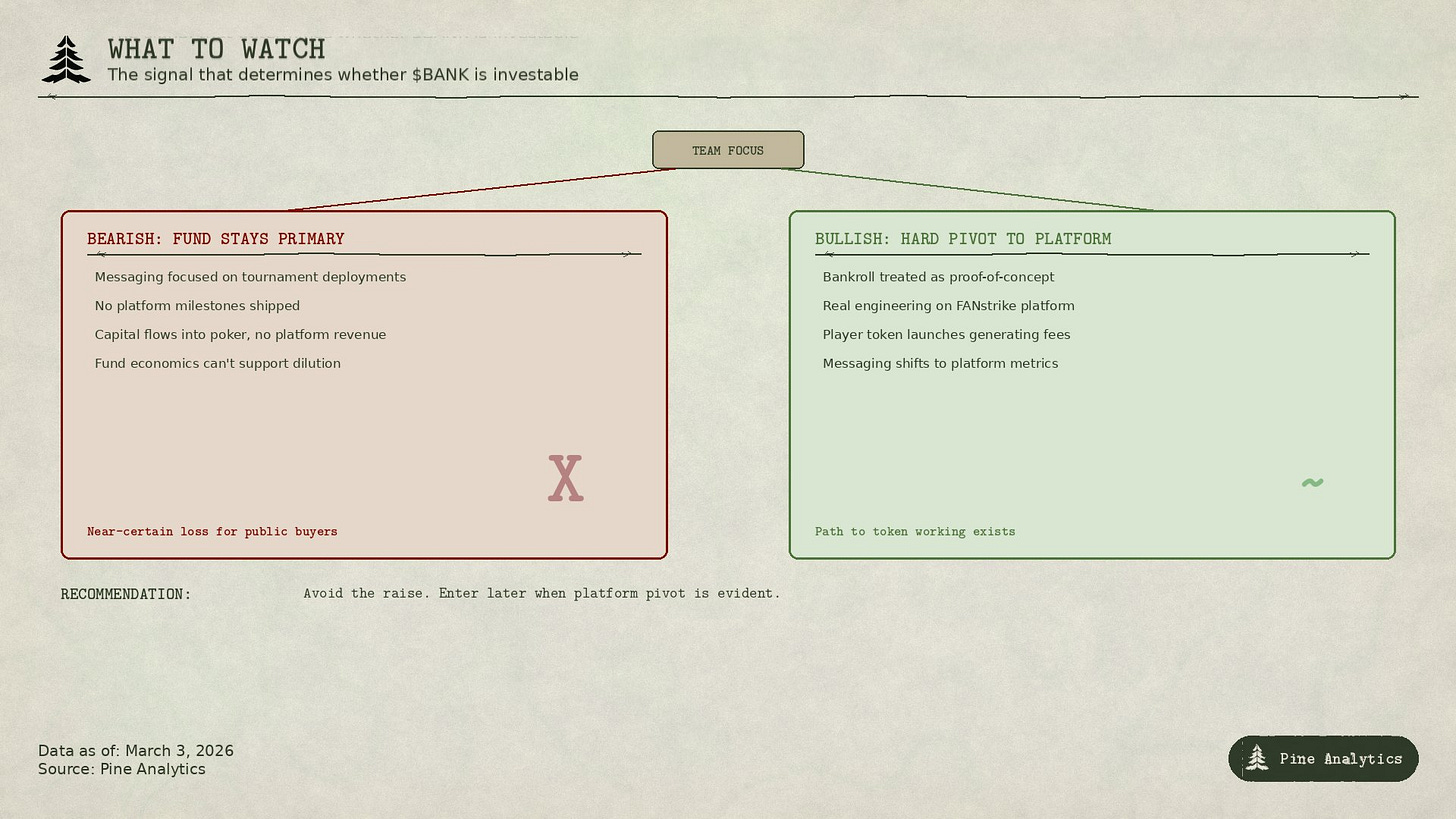 The signal to watch for is a hard pivot. If the team treats the bankroll as a proof-of-concept sideshow and puts its real energy into building, shipping, and scaling the player staking platform, there is a path to the token working. A smart investor should avoid the raise.