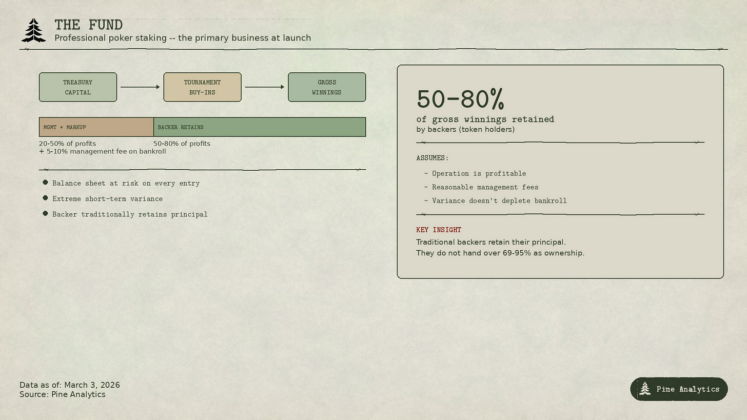 The economics here are well-understood. Professional poker staking operations typically charge a management fee of 5-10% of the bankroll plus 20-50% of net profits as a performance allocation (often called “markup” in poker staking). After accounting for these fees, the backer -- in this case, $BANK token holders via the treasury -- might expect to retain somewhere between 50-80% of gross operating winnings. That is a meaningful haircut, and it assumes the operation is profitable in the first place. This is a capital-intensive, variance-heavy model where the protocol’s own balance sheet is at risk on every tournament entry.