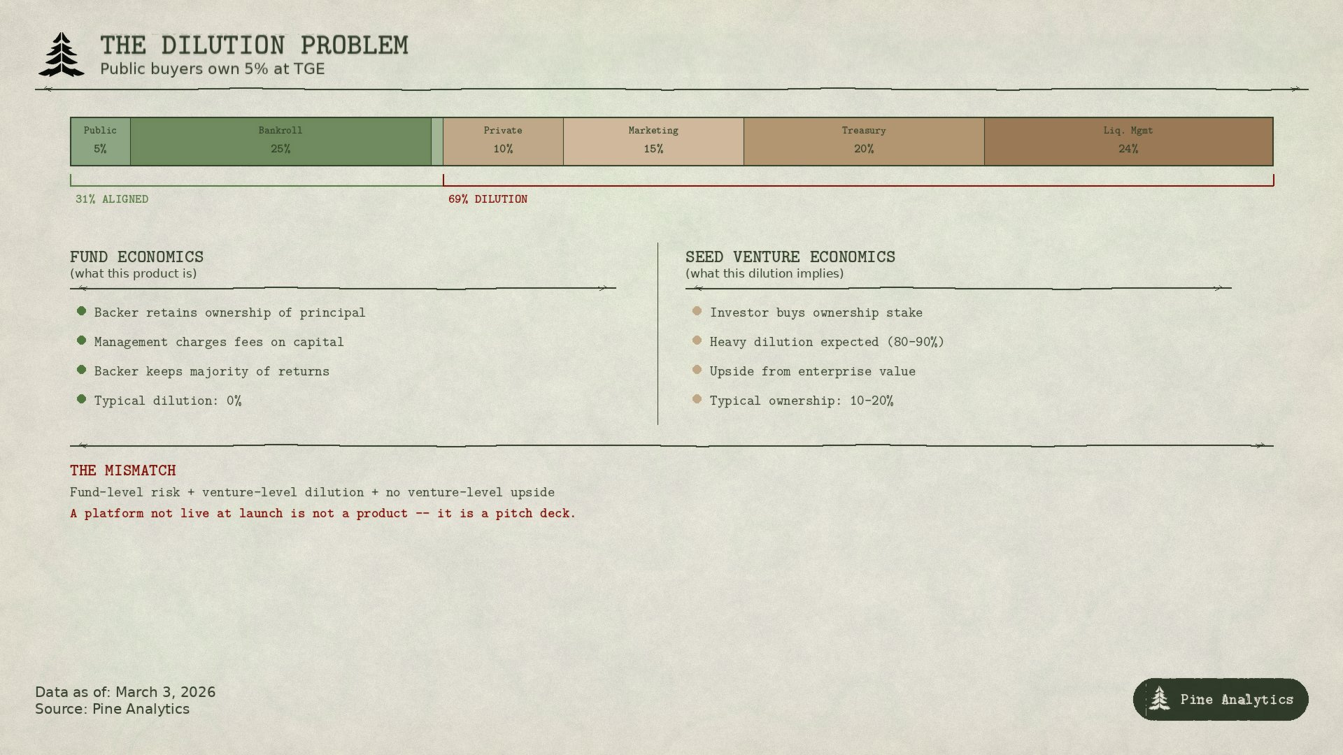 $BANK‘s public buyers get the worst of both worlds: fund-level risk (capital deployed into poker tournaments, subject to variance and management fees) with venture-level dilution (5% ownership at best, 5% of a fund with no compounding equity story at worst). The team might respond that the bankroll generates returns that accrue to all holders through buybacks, or that the platform is in active development. But buybacks funded by poker winnings after a 20-50% performance fee on a 25% bankroll allocation do not math their way into justifying 69%+ dilution. And a platform that is not live at launch is not a product -- it is a pitch deck.