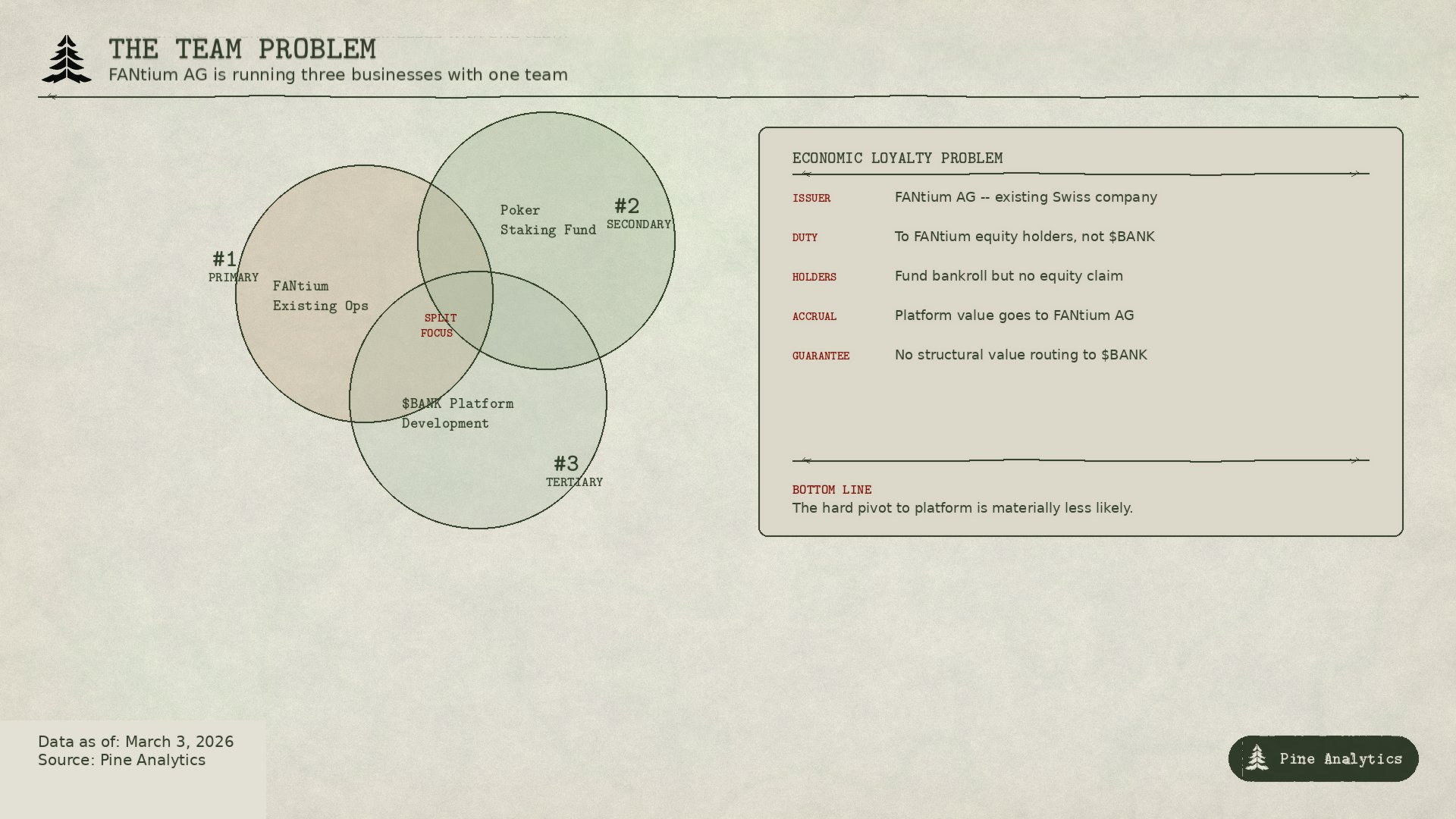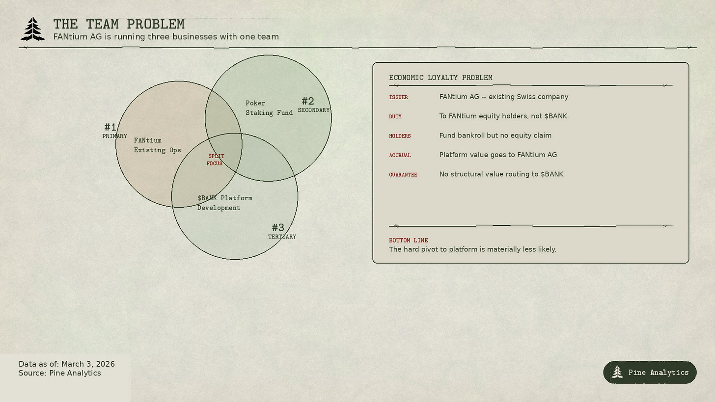 It also raises the question of where economic loyalty sits. FANtium AG is the issuing entity. The team’s fiduciary incentives are to FANtium’s equity holders and its existing operations, not to $BANK token holders. Token holders are funding a bankroll that the team operates, but they have no equity claim on FANtium itself or on the platform revenue if it ever ships. If FANstrike becomes a successful fee-generating platform, the value accrues to FANtium AG as the operating entity. $BANK holders are along for the ride only to the extent the team chooses to route value back through the token -- and there is no structural guarantee that they will.