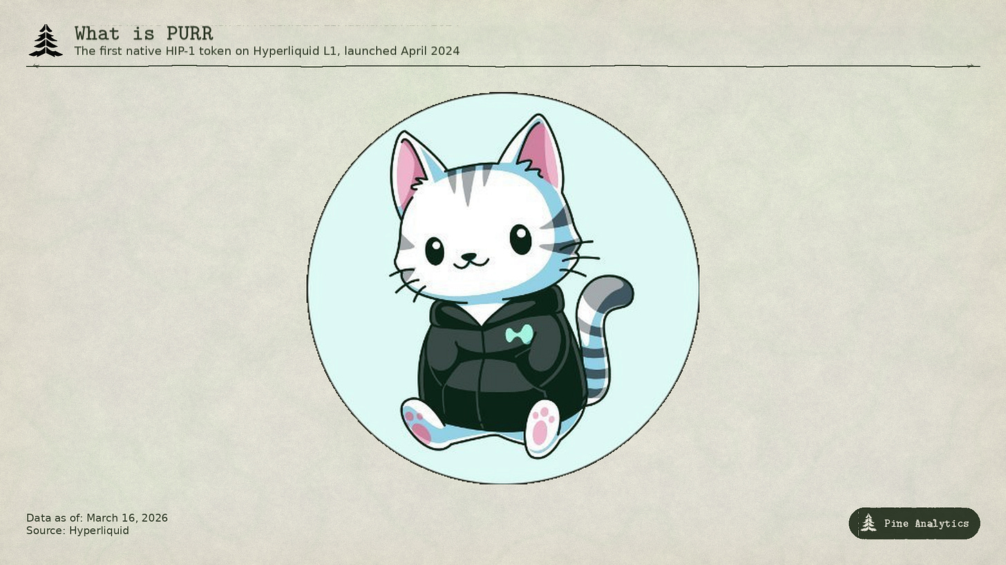 PURR came into existence via an airdrop to Hyperliquid points holders following the first stage of HIP-1, which enabled native tokens and spot trading. It was basically a technical proof of concept: Hyperliquid needed to demonstrate that HIP-1 (their native token standard) and HIP-2 (their permissionless liquidity mechanism) actually worked on mainnet. PURR was the guinea pig, a cat-themed meme token deployed to stress-test the infrastructure before other projects launched spot tokens on the chain. It went live on April 16th, 2024.