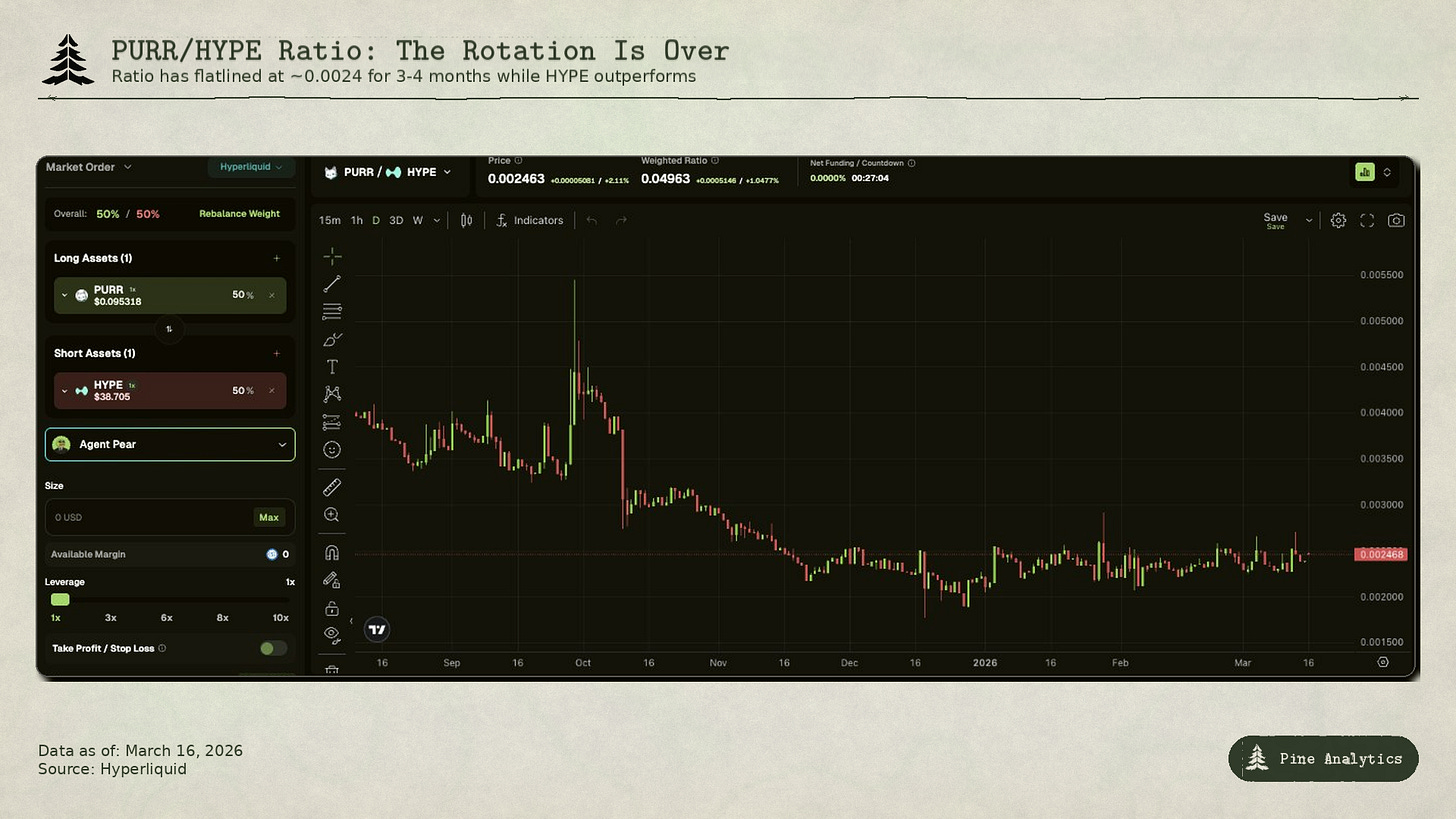 But the chart has entered a fundamentally different regime over the last three to four months. The ratio has flatlined at approximately 0.0024, and it has held that level while HYPE has been one of the strongest performing assets in all of crypto. A flat ratio during a period of significant HYPE outperformance means PURR has been matching HYPE’s dollar returns move for move, without any idiosyncratic catalyst of its own.