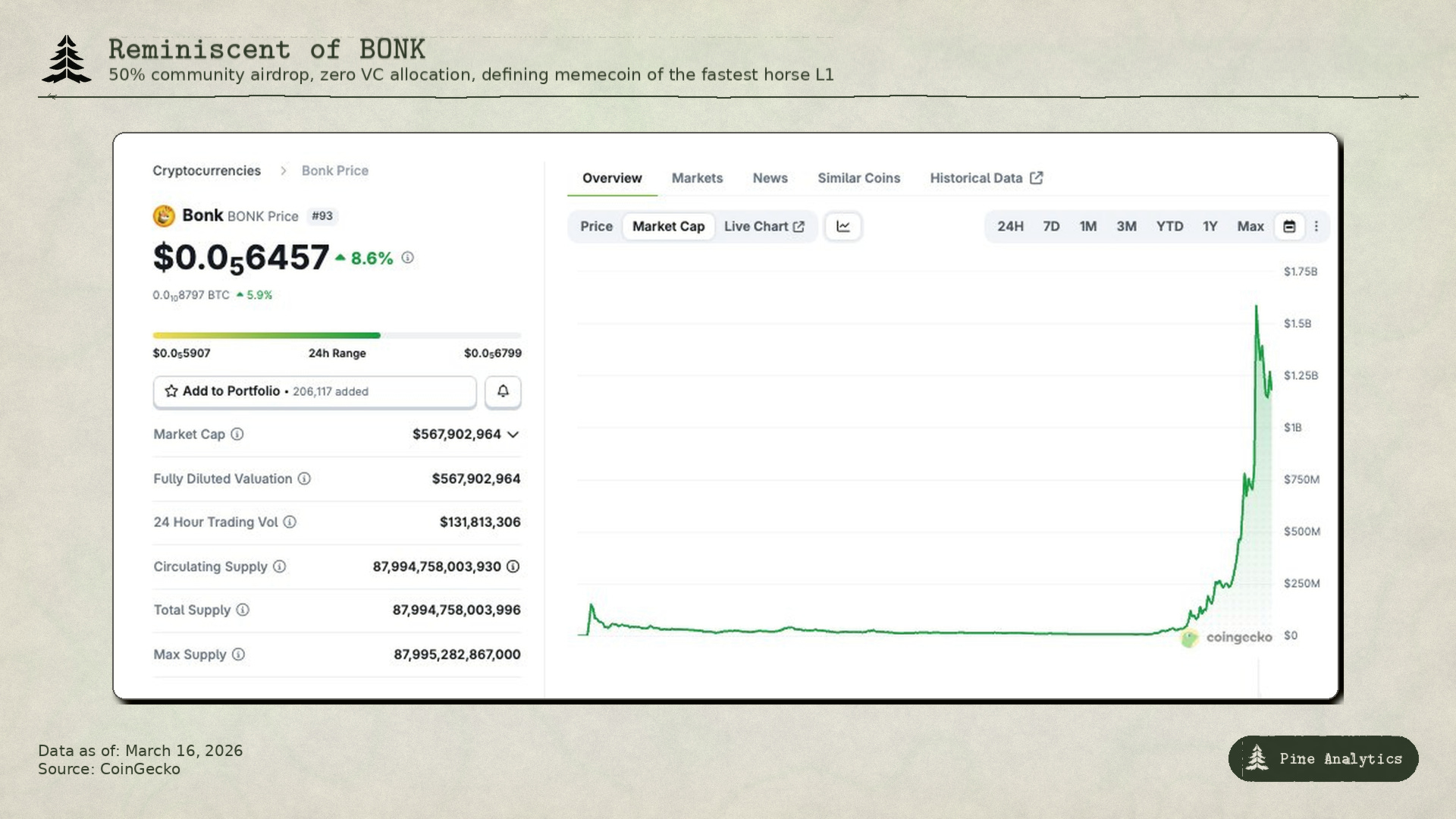 BONK’s recovery is instructive. After bleeding 96% from its January 2023 peak, BonkBot launched in November 2023, and the combination of a product catalyst plus Solana’s macro recovery produced an 11,500% move in roughly two months. Over the following two years, BONK was integrated into over 100 Solana dApps and the team retroactively built a product suite (BonkBot, LetsBonk, Bonk Arena) to justify and sustain the market cap that community energy had already created.