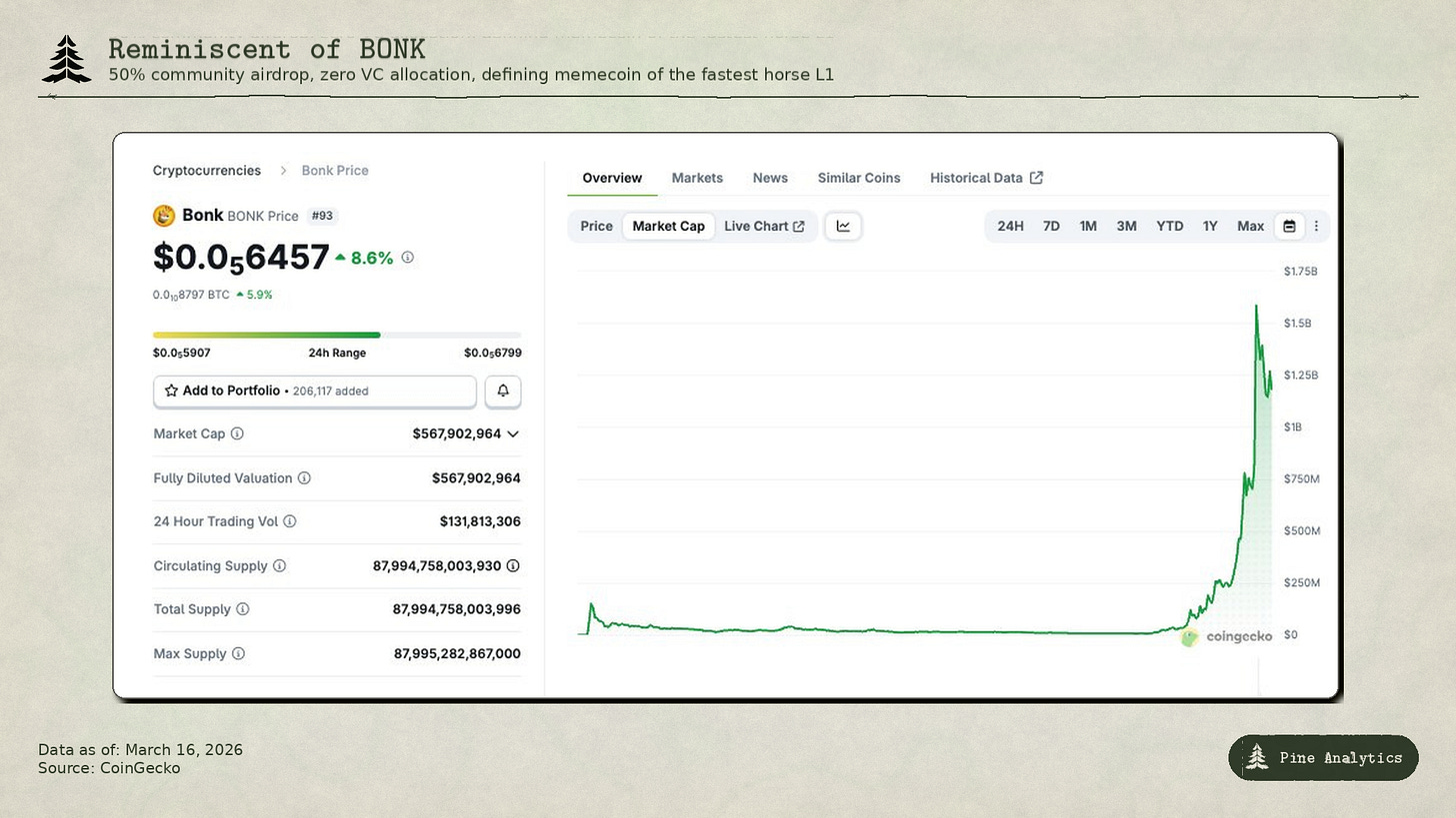 The parallels between PURR and BONK are hard to ignore. Both launched via community airdrops with 50% of supply distributed freely and zero VC allocation. Both were deployed during pivotal moments for their respective L1s: BONK arrived on Christmas Day 2022 to revive Solana post-FTX, PURR launched in April 2024 as Hyperliquid’s first native spot token. Both experienced an initial spike followed by an extended bleed. And both emerged as the defining memecoin of the L1 that is arguably the fastest horse in its respective cycle.