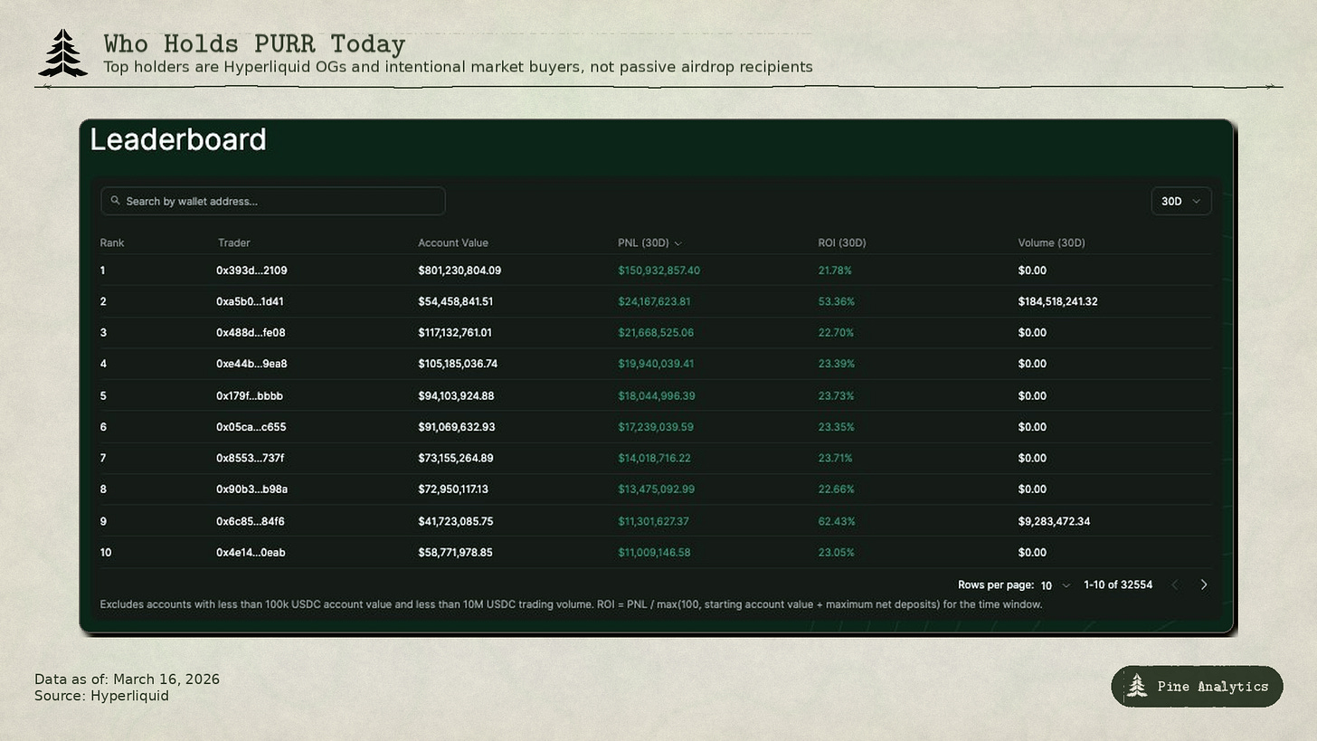 A significant portion did sell. That means the current holder base skews toward two groups: conviction OGs who held through the entire cycle, and market buyers who actively accumulated PURR on the secondary market with real capital. Both represent stickier, more intentional ownership than the original distribution. Compare this to most memecoins, where the launch distribution is the holder base (insiders, snipers, and early LPs), or to protocol tokens with large VC and team allocations on vesting schedules. PURR has neither problem. There are no locked team tokens, no VC overhang, and the airdrop recipients who didn’t want to be there have already cycled out. What remains is fully circulating, deflationary supply held by users who chose to be there.