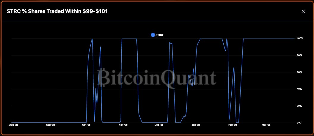 The $99-$101 trading band is the early warning. BitcoinQuant tracks the percentage of shares trading within this range, which has been near 100% recently. A breakdown in this band precedes an issuance pause.