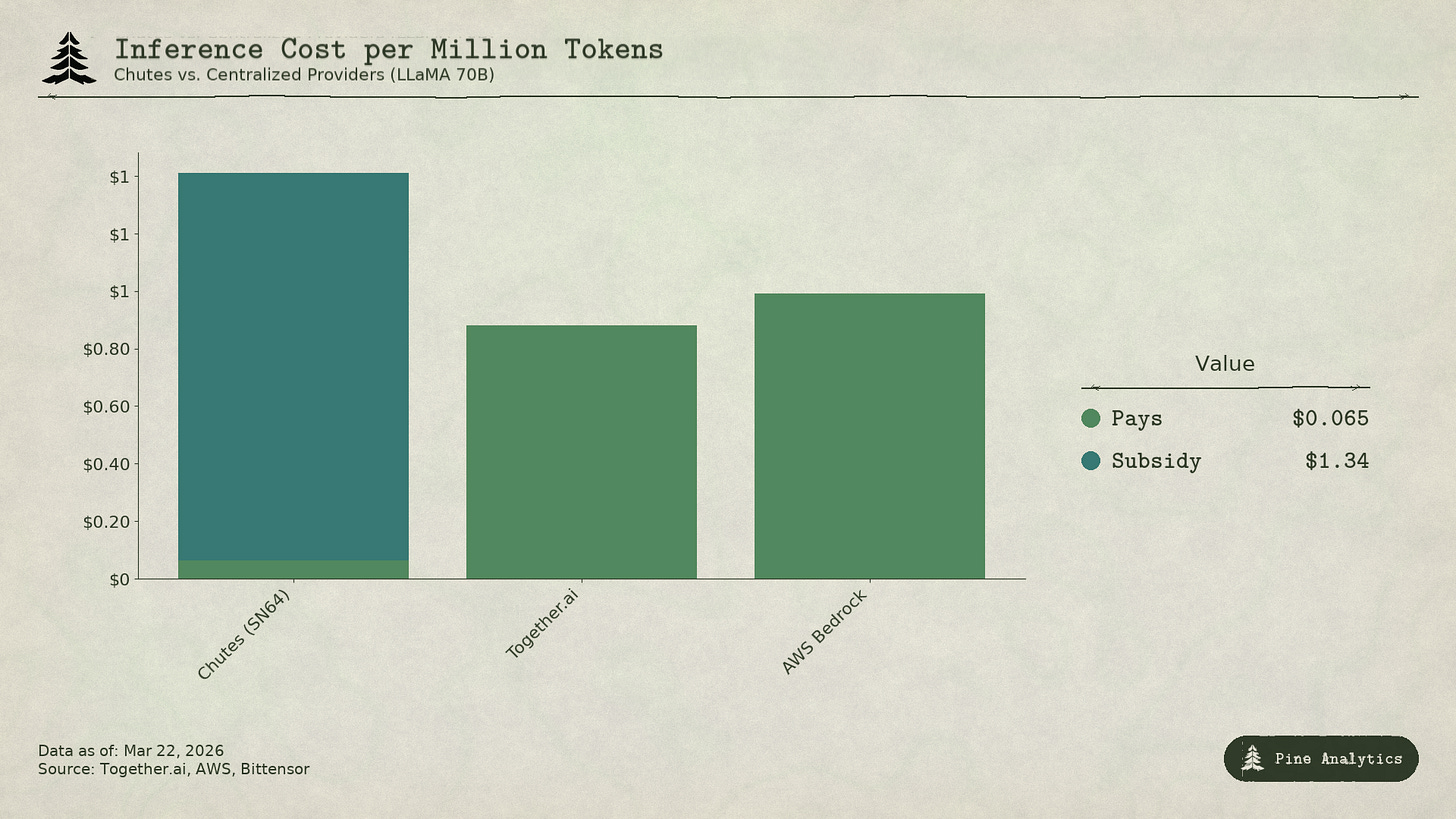 Current market rates for the same open-source models: Together.ai prices LLaMA 3.3 70B Turbo at approximately $0.88 per million tokens. DeepSeek V3 runs at $0.40-0.80 across competitive providers. Smaller models go as low as $0.18 per million. At $1.41 per million, unsubsidized Chutes pricing would be 1.6-3.5x more expensive than centralized alternatives. The cost advantage does not narrow. It inverts entirely. The 85% savings that headline every Chutes discussion are funded by TAO holders through inflation, not by any structural efficiency of decentralization.