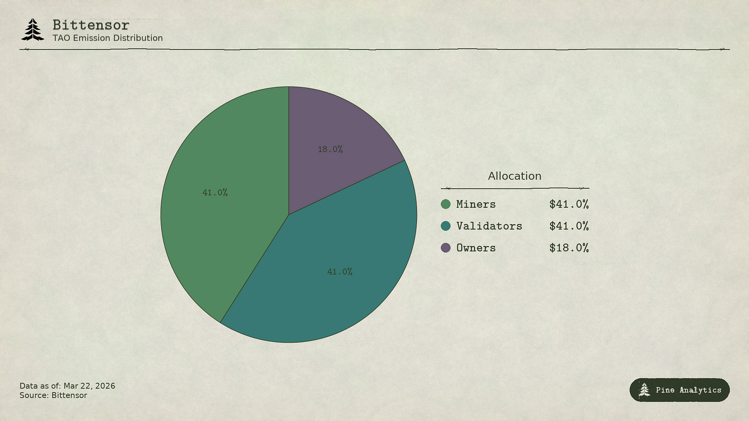 Bittensor’s supply economics are transparent. Daily emissions of 3,600 TAO are split programmatically: 41% to miners, 41% to validators, 18% to subnet owners. The halving schedule is hard-coded. Staking ratios (~70% of supply), emission shares, and flow data are all on-chain. The top 10 subnets control roughly 56% of total emissions.