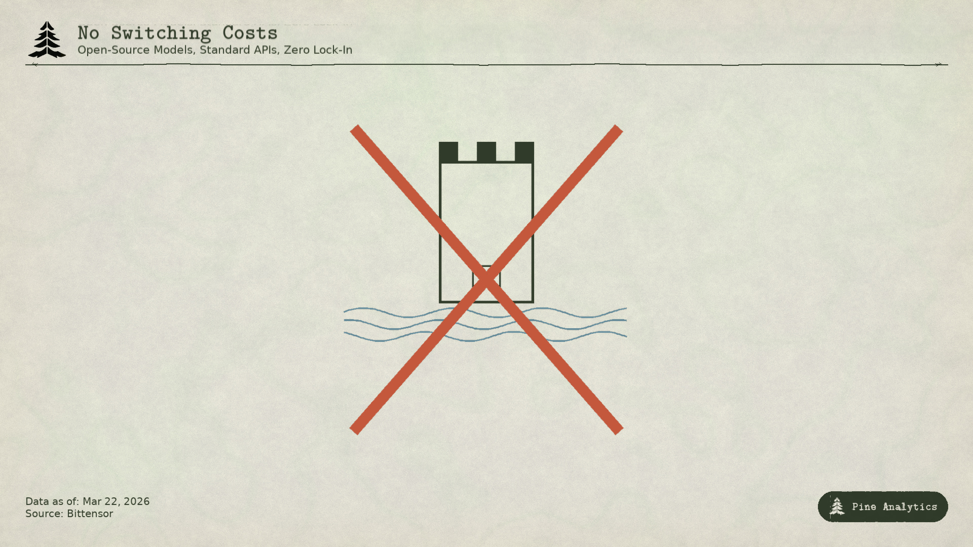 Traditional moats (proprietary technology, network effects, switching costs, brand) do not apply. The technology is open. Network effects accrue to TAO, not individual subnets. Switching costs are zero when every provider serves the same weights. The community argues the incentive mechanism is the moat, but that requires the emission budget to remain large enough to attract compute, and it shrinks with every halving.