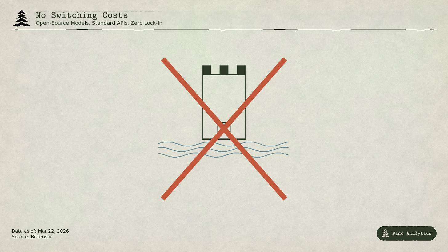 When emissions halve again (projected late 2026 or 2027), either pricing roughly doubles, miners leave the subnet, or the gap between subsidy and revenue widens further. The obvious rebuttal is that this resembles standard startup bootstrapping: subsidize early to build network density, then raise prices once users are locked in. Uber, DoorDash, and AWS all ran this playbook. The difference is that those companies built switching costs during the subsidy period (proprietary platforms, driver networks, enterprise integrations). Bittensor subnets build none. The models are open source, the APIs are standard, and users can migrate to any provider serving the same weights with zero friction. When the subsidy shrinks, there is no lock-in to prevent churn.