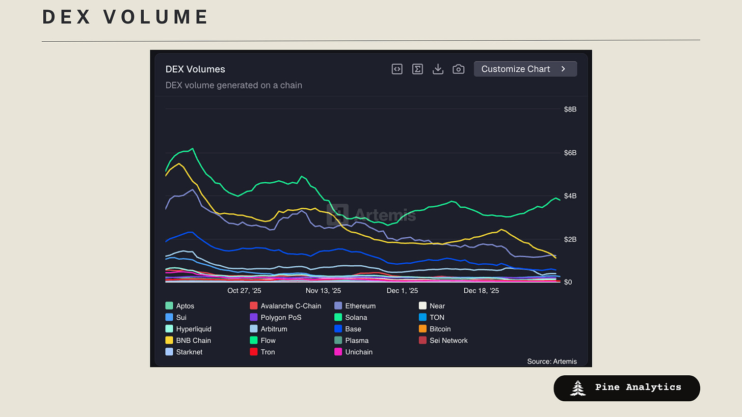 Top chains by DEX volume: Solana $3.9B (+21.9%), Ethereum $1.2B (~0.0%), BNB Chain $1.1B (–38.9%), Base $553.4M (–8.2%), Arbitrum $383.9M (–35.2%), Sui $274.2M (+32.9%), Polygon PoS $190.6M (+5.7%), Avalanche C-Chain $167.6M (–10.2%).